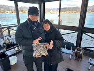 諏訪湖は桟橋付近の浅瀬が少し氷が張ってました。
