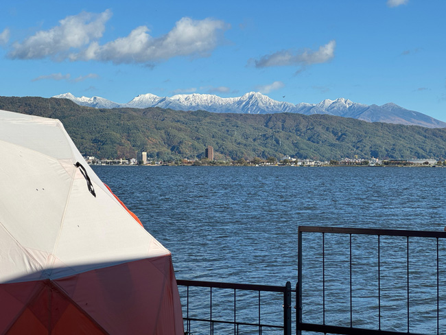 諏訪湖から見える八ヶ岳が白くなり始めました。