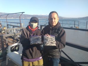 台船内だとベタのワカサギは魚探でもなかなか映りにくいですが、誘えば当りは来ます。